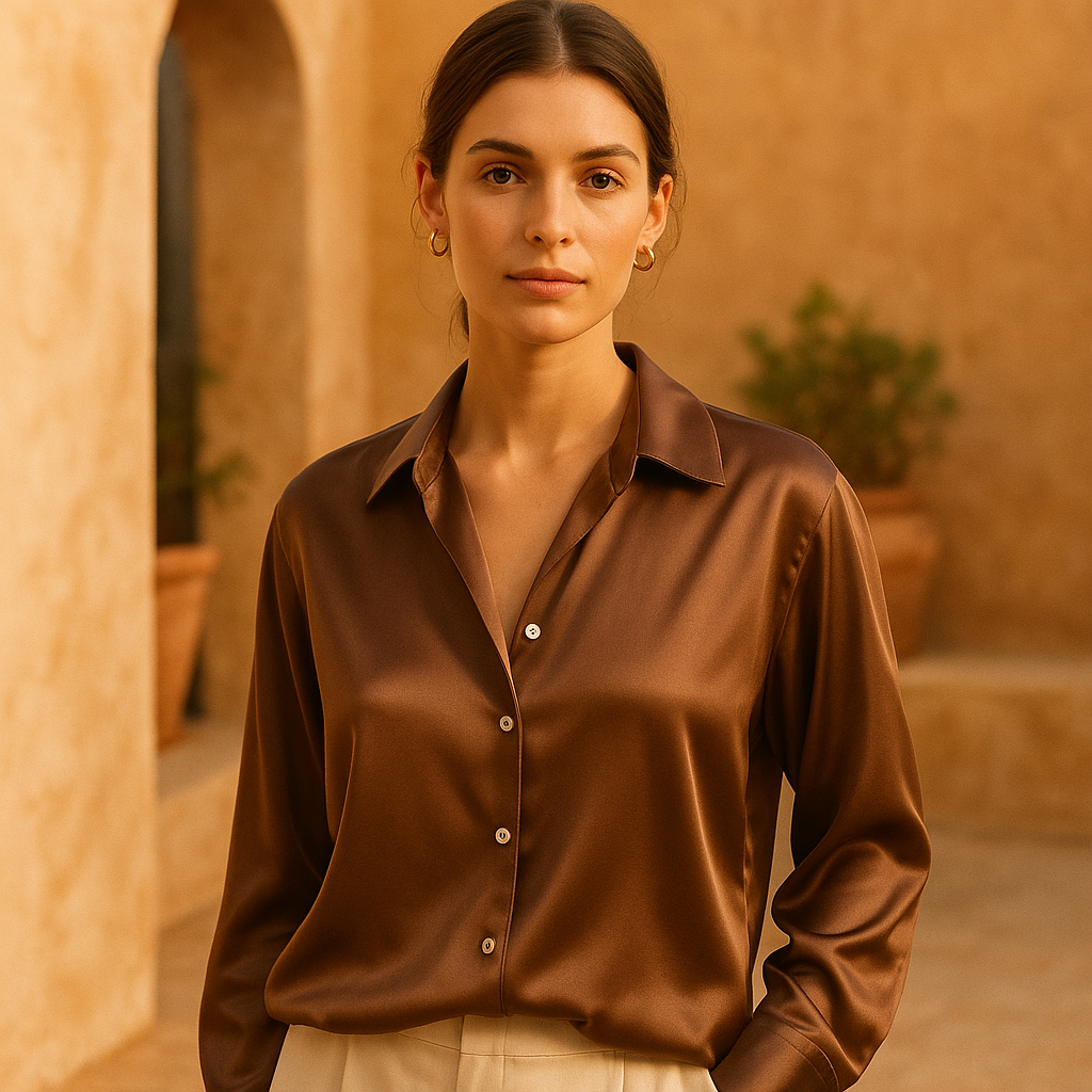 La feminidad convertida en elegancia. Esta blusa captura la esencia de los atardeceres florentinos donde el tono tierra abraza la silueta como las colinas toscanas al ocaso. La seda premium fluye con la gracia de las brisas del Arno mientras el corte italiano define la sofisticación absoluta. Para mujeres que comprendan que la verdadera elegancia reside en la simplicidad refinada.