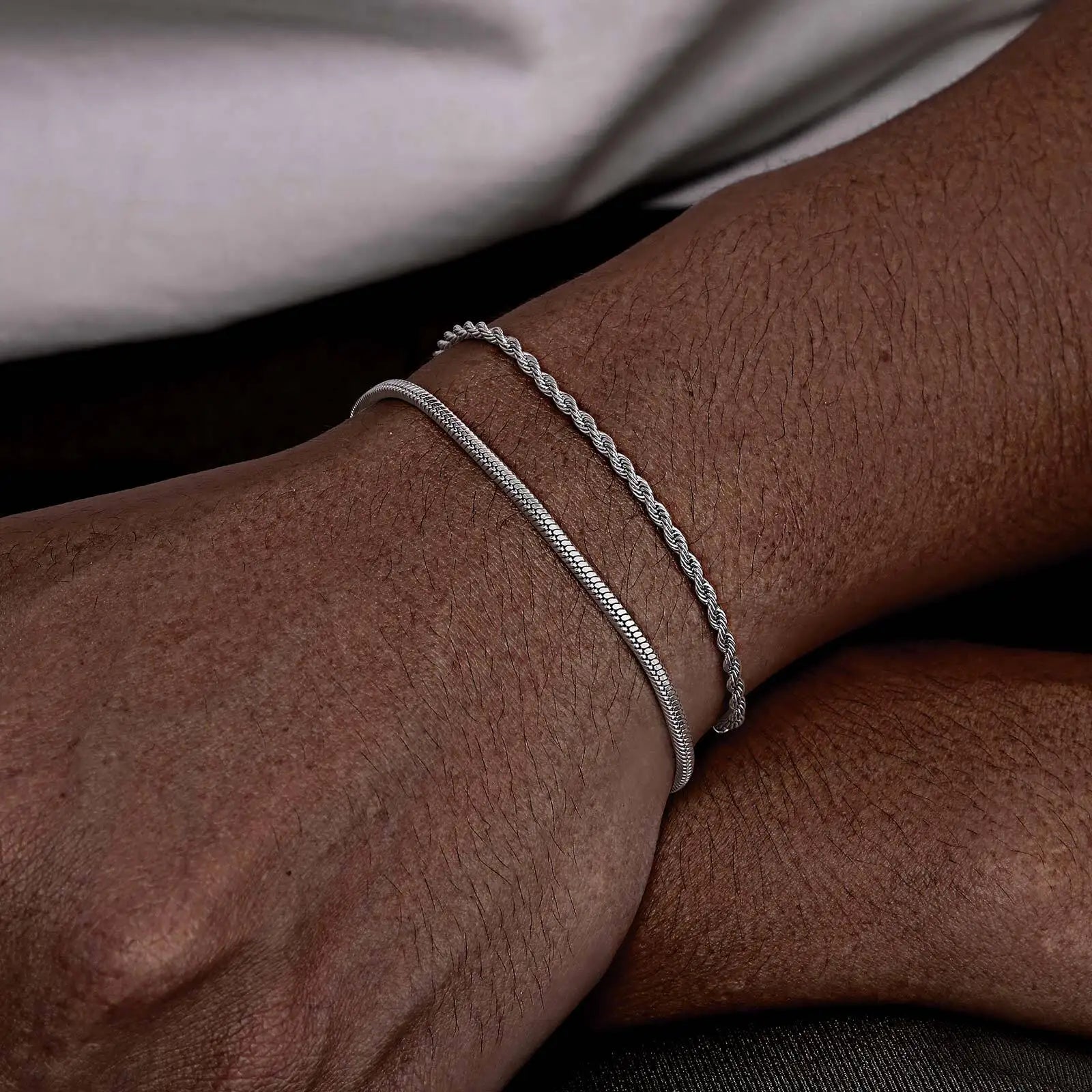 Set de 2 pulseras masculinas forjadas en la tradición renacentista italiana. Cadena trenzada ajustable 16-21cm y eslabones serpiente 21-24cm que abrazan la muñeca con la sofisticación de las colinas de Urbino. Disponible en acabado plata mediterránea que refleja la pureza del Adriático, y oro mediterráneo que evoca los reflejos dorados del atardecer toscano. Diseño versátil que captura la esencia de la artesanía italiana con elegancia contemporánea.
